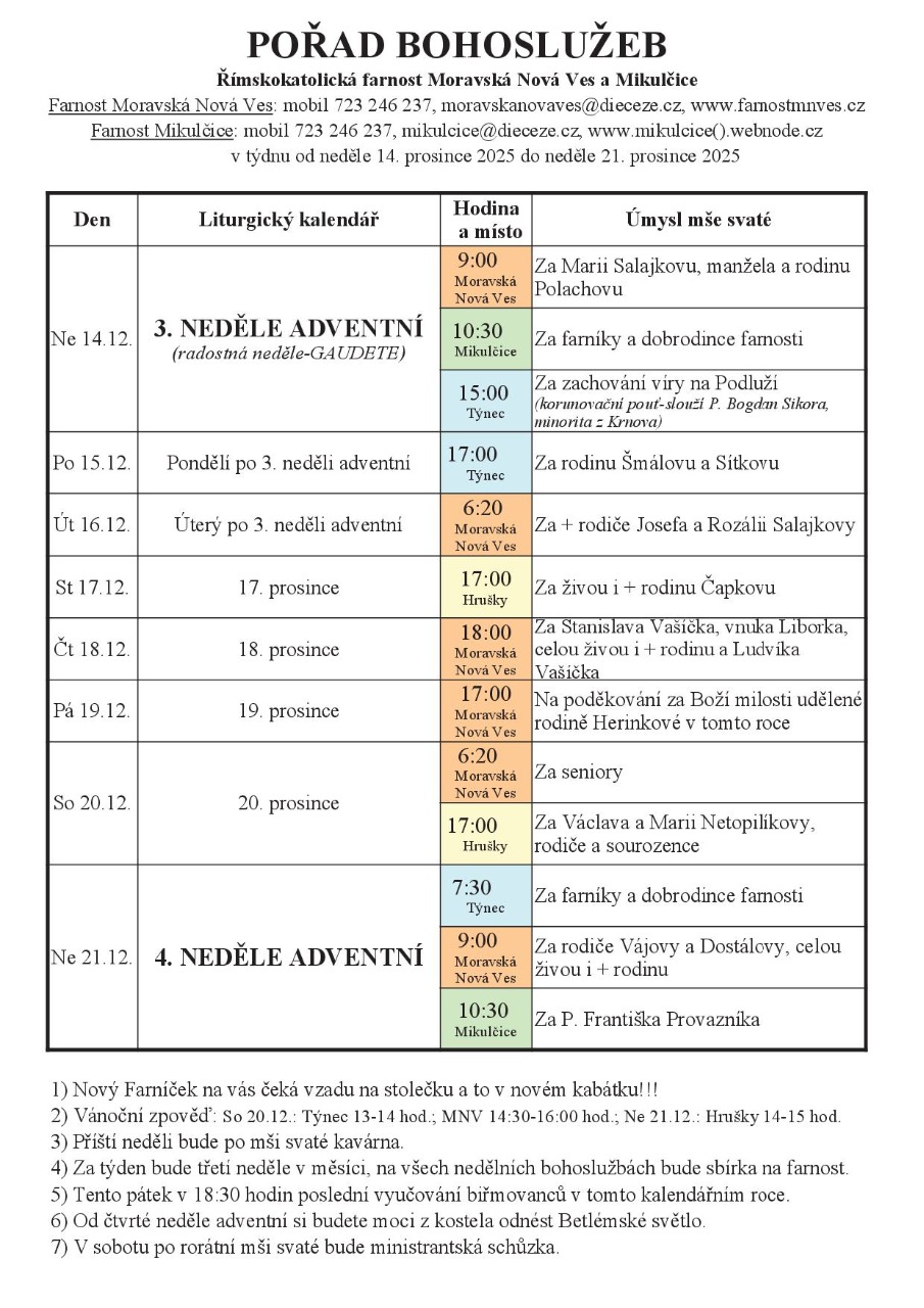 Vánoční zpověď: So 20.12.: Týnec 13-14 hod.; MNV 14:30-16:00 hod.; Ne 21.12.: Hrušky 14-15 hod.