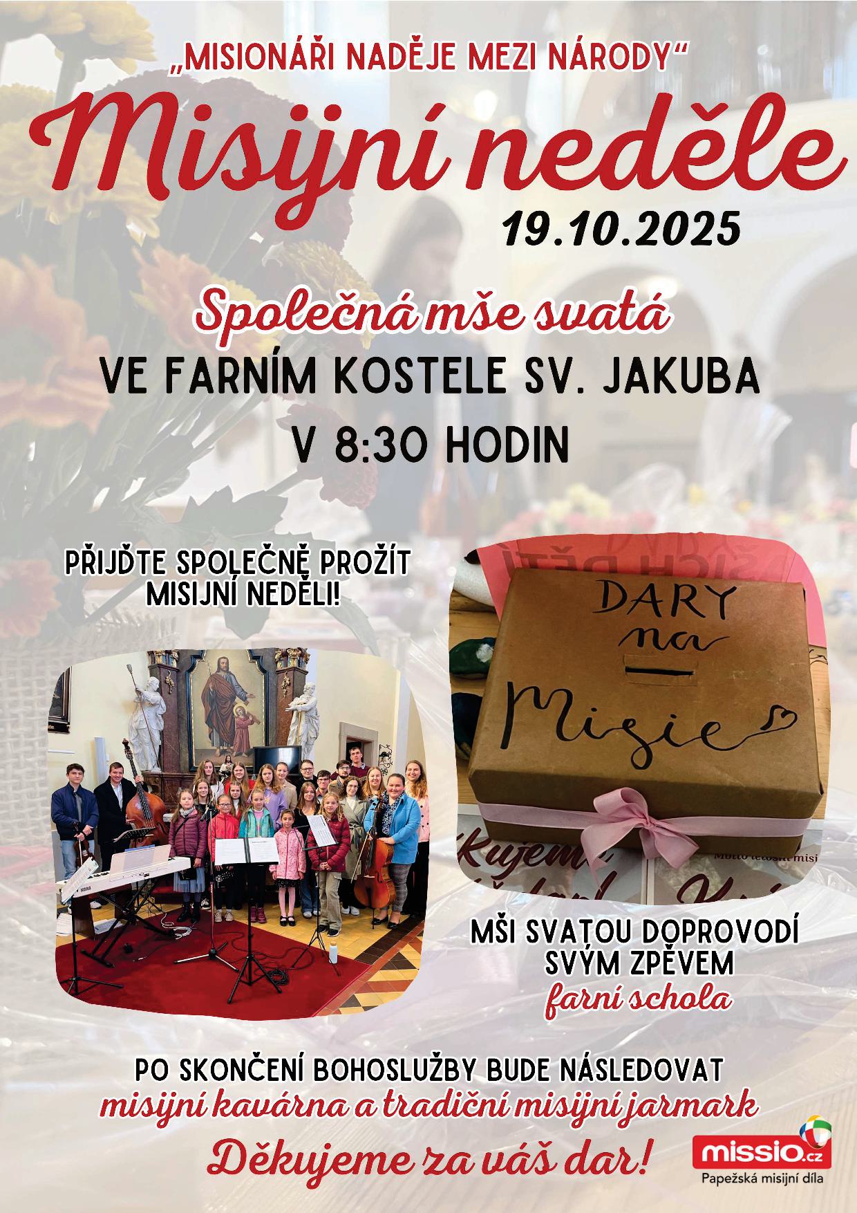 Na misijní neděli 19.10. bude mše svatá o půl hodiny dříve, tedy v 8:30 hodin!!!! Na ní bude zpívat naše schola mladých. Po mši svaté proběhne již tradiční Misijní jarmark, na který i vy můžete přispět svými ručními a domácími výrobky. Dále proběhne také Misijní tombola, kterou si na starosti vzaly maminky z Týnce. Přispět na Papežské misijní dílo můžete i ve farní kavárně, která pro vás bude připravena před farním kostelem.